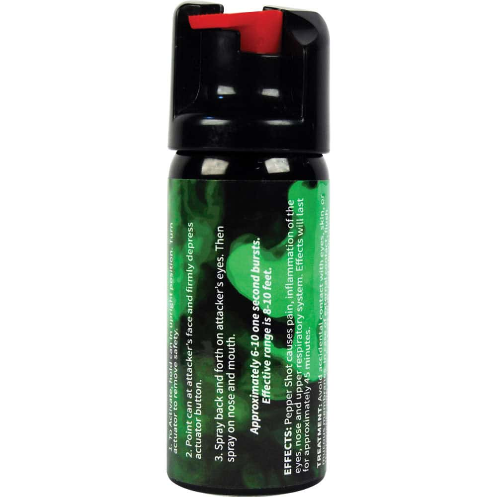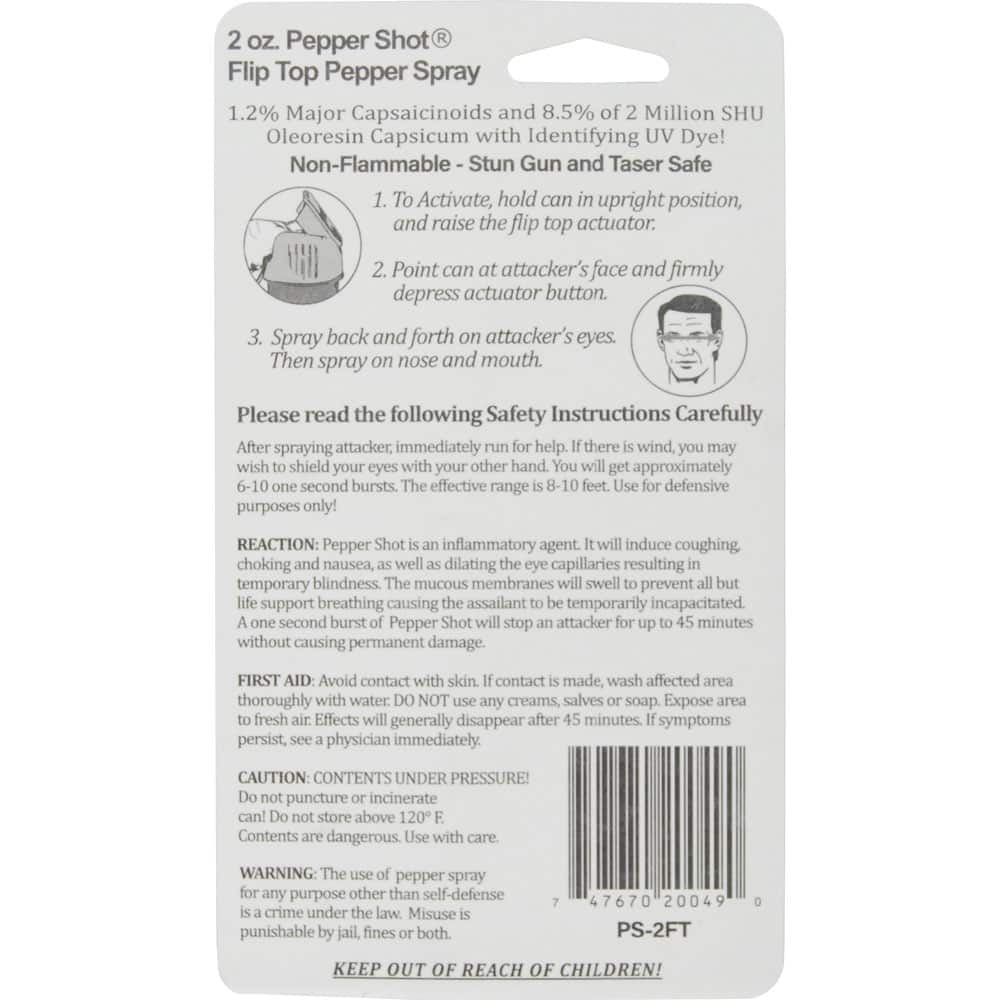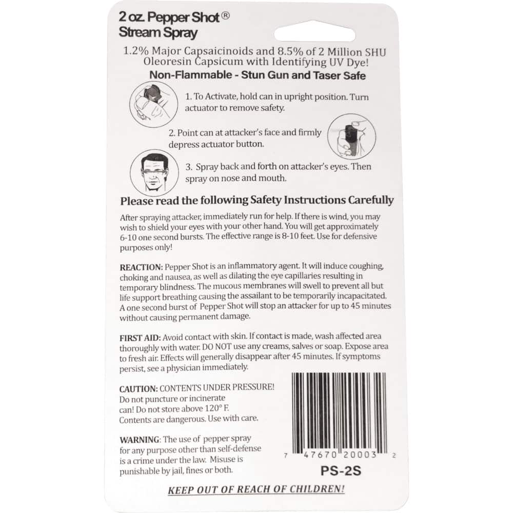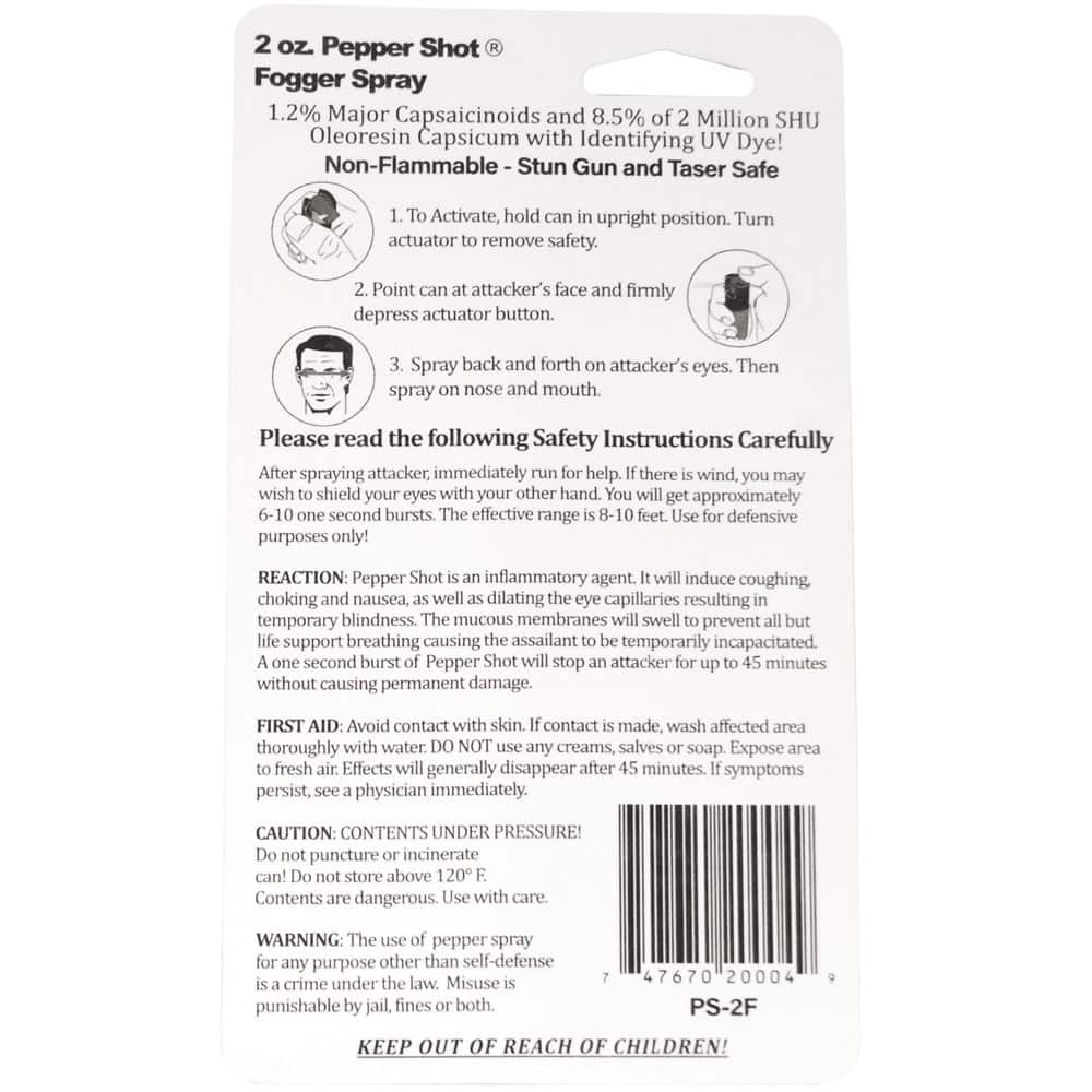 The Pepper Shot 1.2% MC 2 oz Pepper Spray delivers immediate incapacitation through 1.20% Major Capsaicinoids—the actual heat measure that determines stopping power. The Fogger, Stream delivery pattern creates effective coverage at 8-10 feet, giving you critical distance from threats. The 2 oz size ensures daily carry compliance—protection only works when you have it.